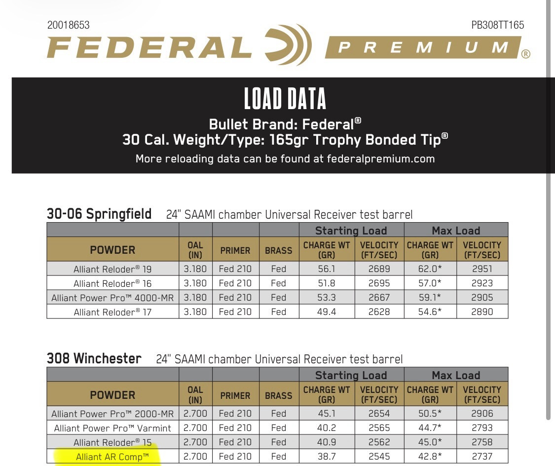 Puoi usare i valori indicati sul sito Federal per sicurezza, anche se con una polvere più lenta come la N140 potresti mettere leggermente più polvere. Tuttavia, sono molto simili, quindi puoi basarti con la AR Comp per iniziare a sviluppare una ricarica.