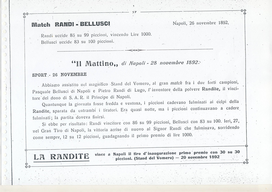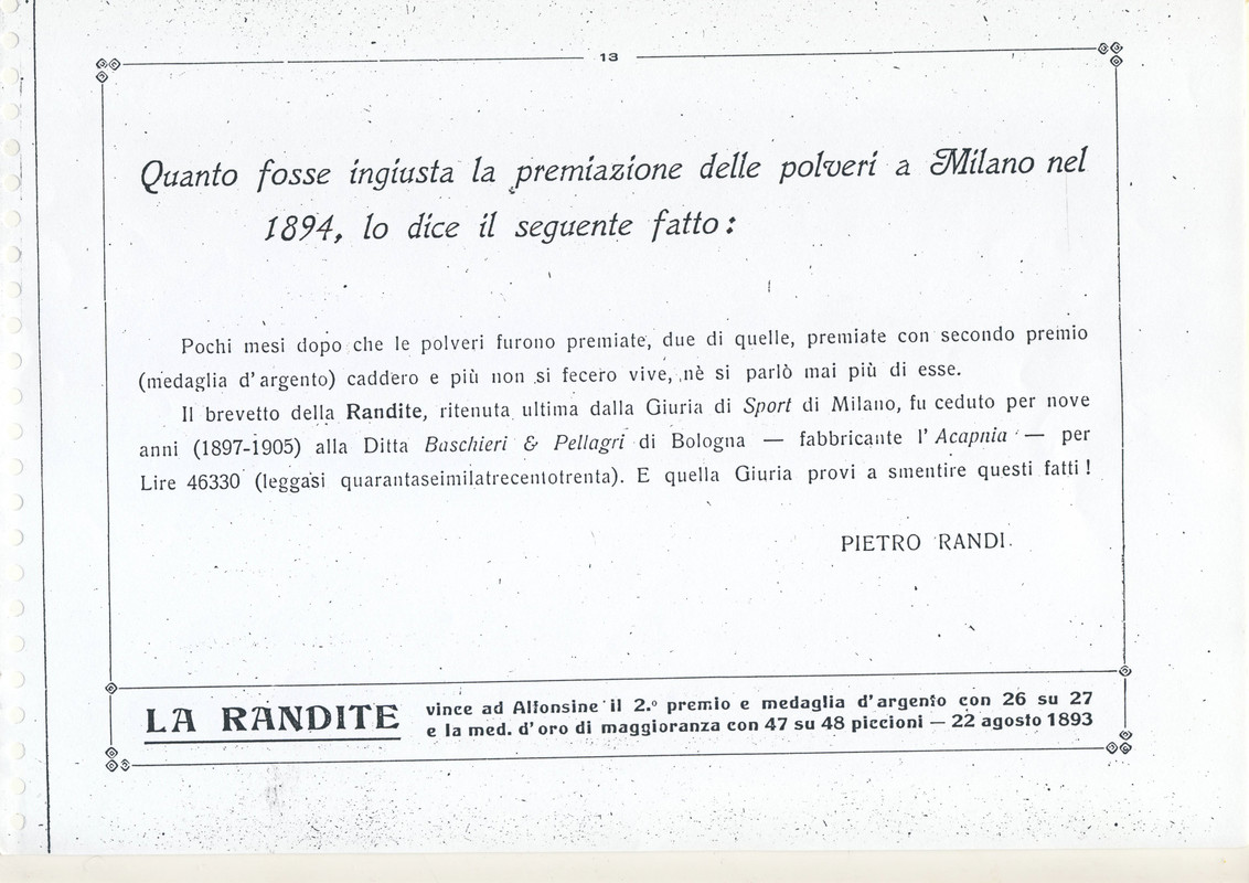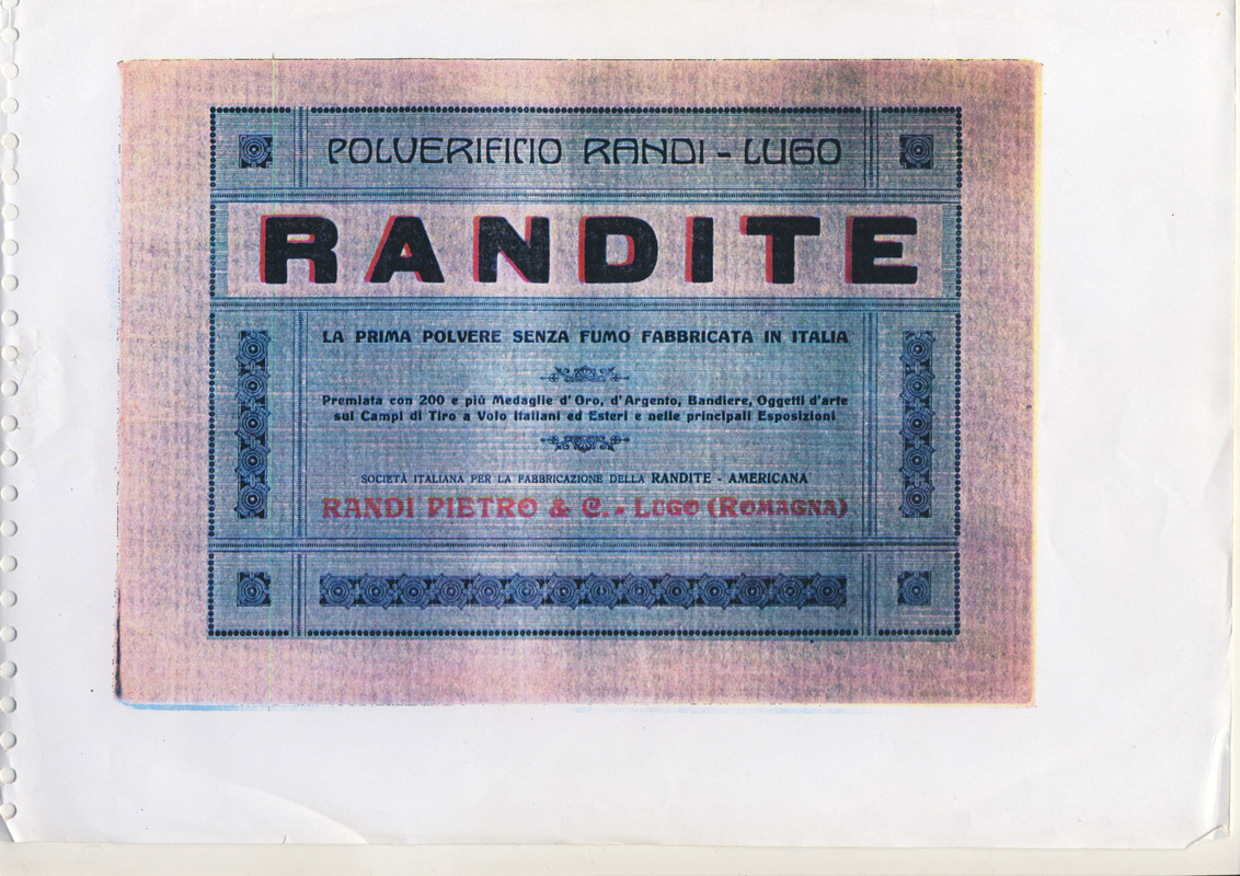 Nata intorno al 1880 nel polverificio di Pietro Randi a Villa S. Martino nel Ravennate. Polvere granulare e voluminosa, di colore giallo vivo, alla Nitrocellulosa non gelatinizzata, porosa e abbastanza vivace, infatti sui dosaggi dell'epoca l'innesco consigliato era addirittura il 4,45. Verso la fine dell'800 e gli inizi del secolo scorso questa polvere è stata protagonista di critiche e apprezzamenti. Si contendeva i campi di tiro al piccione con la mitica Acapnia, l'Aristite, La Nivea, La schultze, L'Amberite..... Dal 1897 al 1905 la produzione della randite passò alla famosa ditta Bolognese Baschieri & Pellagri per lire 46330 per poi tornare a essere prodotta a Lugo di Romagna. Vi posto parte della documentazione.