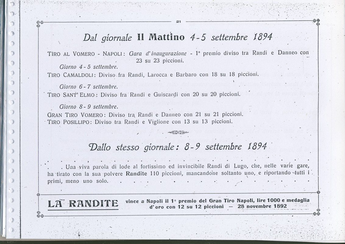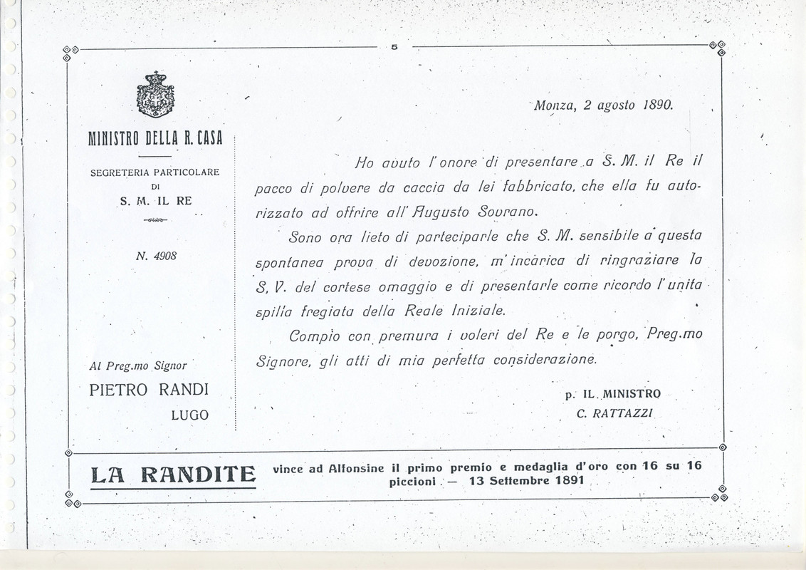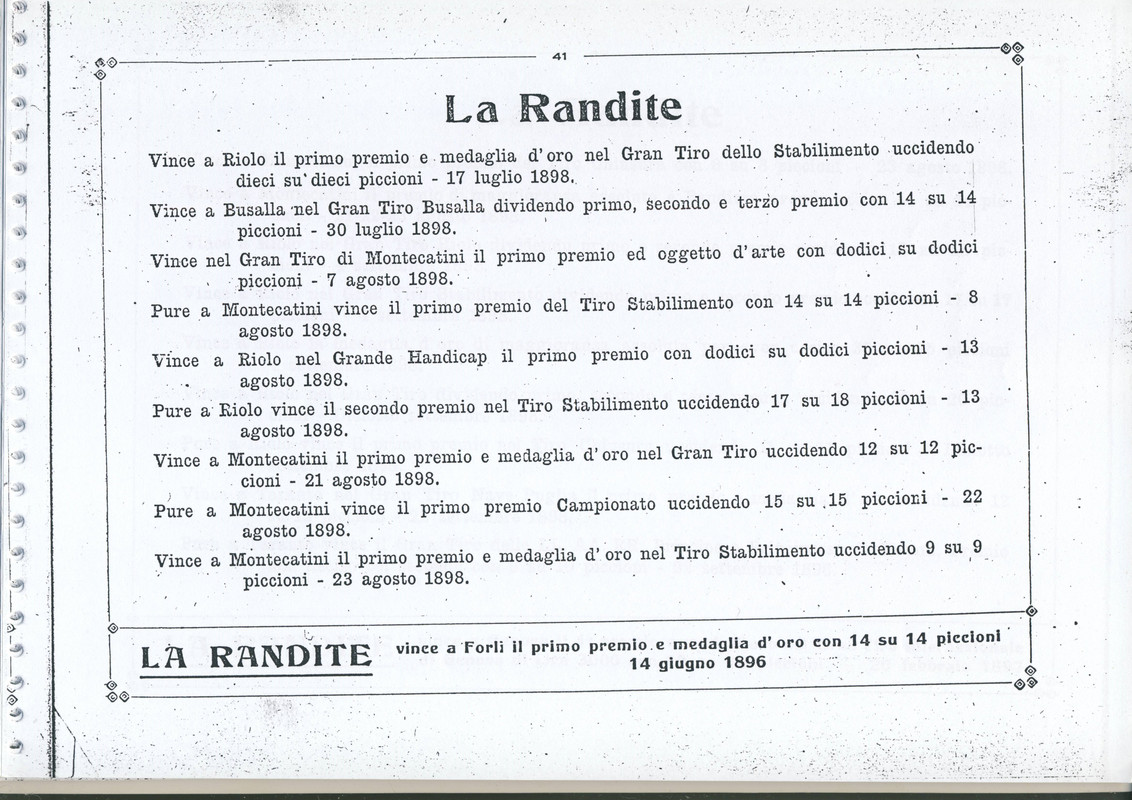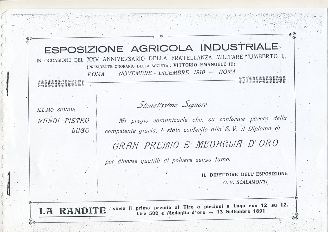 Nata intorno al 1880 nel polverificio di Pietro Randi a Villa S. Martino nel Ravennate. Polvere granulare e voluminosa, di colore giallo vivo, alla Nitrocellulosa non gelatinizzata, porosa e abbastanza vivace, infatti sui dosaggi dell'epoca l'innesco consigliato era addirittura il 4,45. Verso la fine dell'800 e gli inizi del secolo scorso questa polvere è stata protagonista di critiche e apprezzamenti. Si contendeva i campi di tiro al piccione con la mitica Acapnia, l'Aristite, La Nivea, La schultze, L'Amberite..... Dal 1897 al 1905 la produzione della randite passò alla famosa ditta Bolognese Baschieri & Pellagri per lire 46330 per poi tornare a essere prodotta a Lugo di Romagna. Vi posto parte della documentazione.