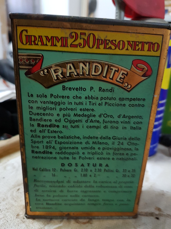 Comunque buona l'uso della canna manometrica, sempre in canna manometrica se hai a disposizione dei 6,45 al fulminato (ben conservati) io ci farei qualche carica, tieni presente la Randite si usava anche con i fucili a bacchetta (pratica che io sconsiglio) che usano delle piccole capsule al fulminato.