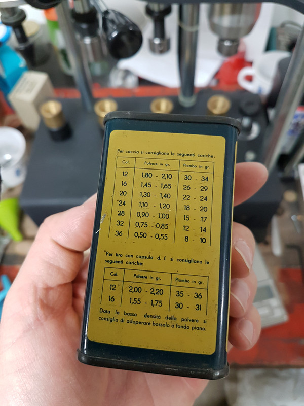 Non ho mai avuto quella polvere, comunque un mio amico la caricò su bossolo in plastica 12/70, innesco dfs 6,15, contenitore Gualandi: 1,80x32, orlo stellare e devo dire che andava molto bene, nonostante l'età. Appena sento il mio amico gli dico se l'ha bancata o no.