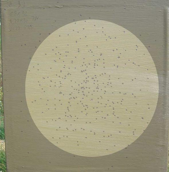 La Sidna delle cartucce provate è "Sidna 2" del barattolo cilindrico verde, acquistata alcuni anni fa; il bossolo è un 12/70 (reali 68,8 mm.) NSI Italia T.1 verde con U.688 e una dose di g. 1,57x32 di piombo n. 7,5 nik. con borra Super G 22/19 e stellare a 57,5 mm.
