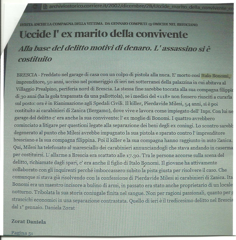 Bruno, eccoti l'articolo di stampa che pubblicava la notizia sull'uccisione dell'incisore bresciano Italo BONOMI.