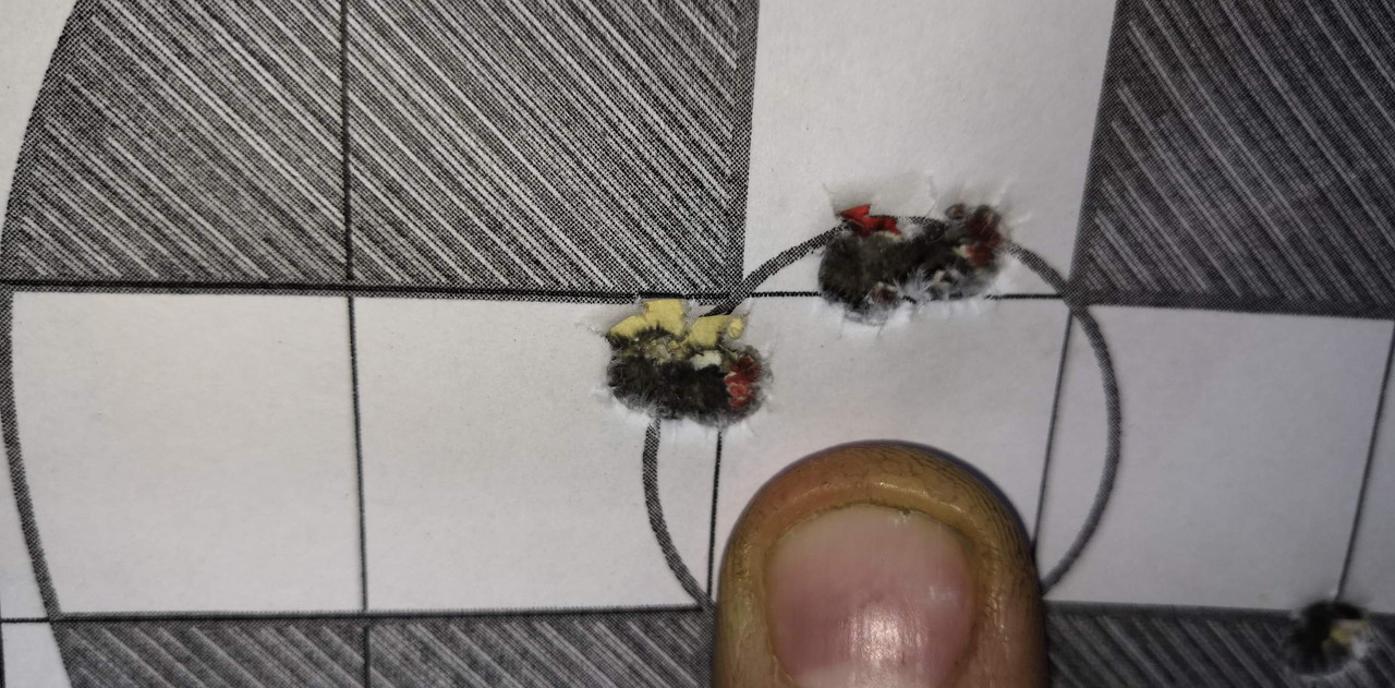 La v0 rilevata col magneto Speed è risultata essere di 905 ms (in canna da 61 avevo circa 975 ma) con una costanza impressionante (906/905/904/905) e la rosata della foto a 100 MT.