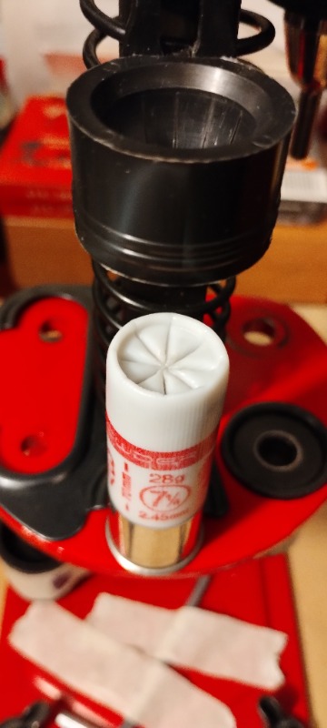 Beh...anche io sono sempre stato scettico sulla riuscita di queste presse made in USA...poi, però un giorno ne ho ricevuta una in dono, la Mec 600 junior mark 5 cal 12, ho iniziato a girare in rete dove vi sono molti video tutorial per capire bene come regolare le stazioni....dopo un po di bossoli sciupati ho iniziato a fare bene, tanto è vero che acquistai anche i kit per il cal 28 e cal 410. Quindi mi sono regalato la Mec Sizemaster cal 20 che di diverso ha l'innescatore automatico di serie e il calibratore a pinza anziche ad anello. In questa foto si puo vedere un bossolo di primo sparo trattato con la 600 junior mark 5