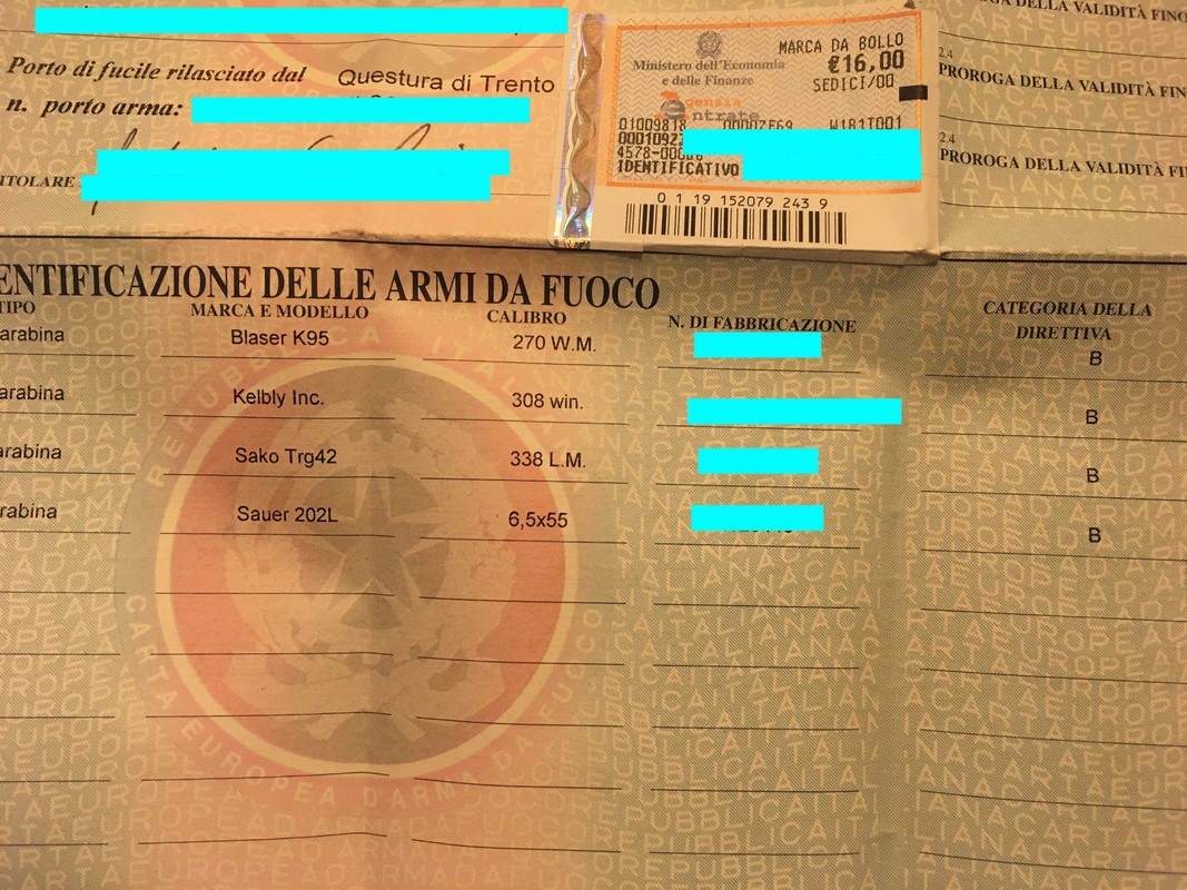 Sulla mia carta europea semiautomatico B4, sovrapposto C1, carabina bolt action C2.