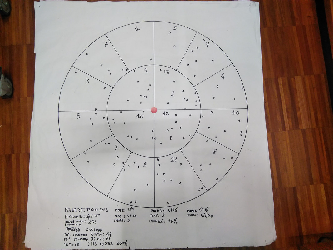 Eccomi qua con delle prove fatte oggi a 35 metri e 45 metri, su bersagli autocostruiti con diametro di 75cm per il cerchio esterno e 35cm per il cerchio interno. Questo è il risultato finale ed il migliore dopo varie prove eseguite con altri assetti che mi hanno portato a usare inneschi CX2000 per tutte le configurazioni, borra GT21 per le 36grammi e Lb6 per le 40 grammi. 5 colpi per ogni tipologia con risultati ognuno fondamentalmente simile agli esempi postati) (ho fatto prove con borre ZM15, GT18, Magnum H13 e inneschi U688, CX2000 e DFS616).
