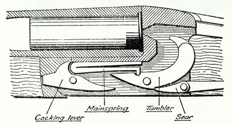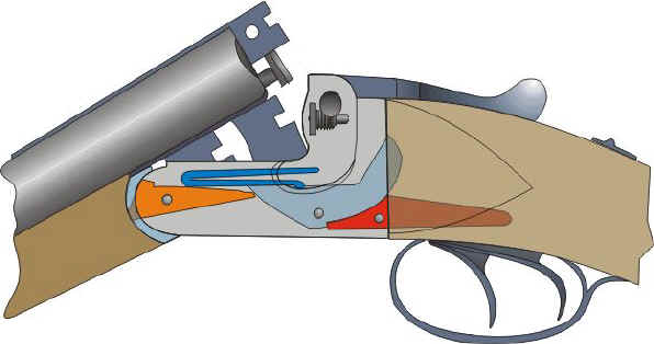la batteria Anson e Deeley é caratterizzata da tre pezzi fondamentali, molla, percussore e stanga di scatto.