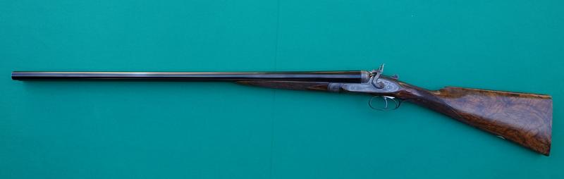 Abbiamo di fronte la quintessenza del fucile a cani esterni, riprendendo la frase di un noto Autore ........ Questo Bar in Wood è la versione definitiva .... La versione precedente (prendendo a riferimento un esemplare del 1870) è esternamente molto simile e ugualmente affascinante , e si distingue principalmente per alcuni particolari : chiave d'apertura all'esterno della parte anteriore della guardia paragrilletto, abbastanza bene occultata e senza particolari sporgenze --- cani di forma leggermente diversa e che armati sovrastano lateralmente la linea di mira --- canne in damasco ............. Dalle foto dell'eccellente restauro non invasivo si deduce che il fucile è stato conservato con attenzione per ben oltre un secolo. Forse sarebbe anche troppo pretendere che l'interno dell'anima di canna possa essere rimasto perfetto.Commenta